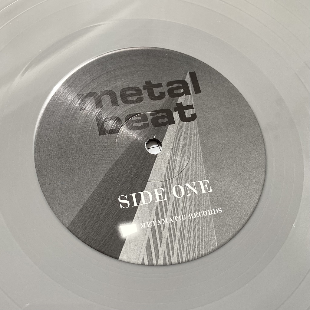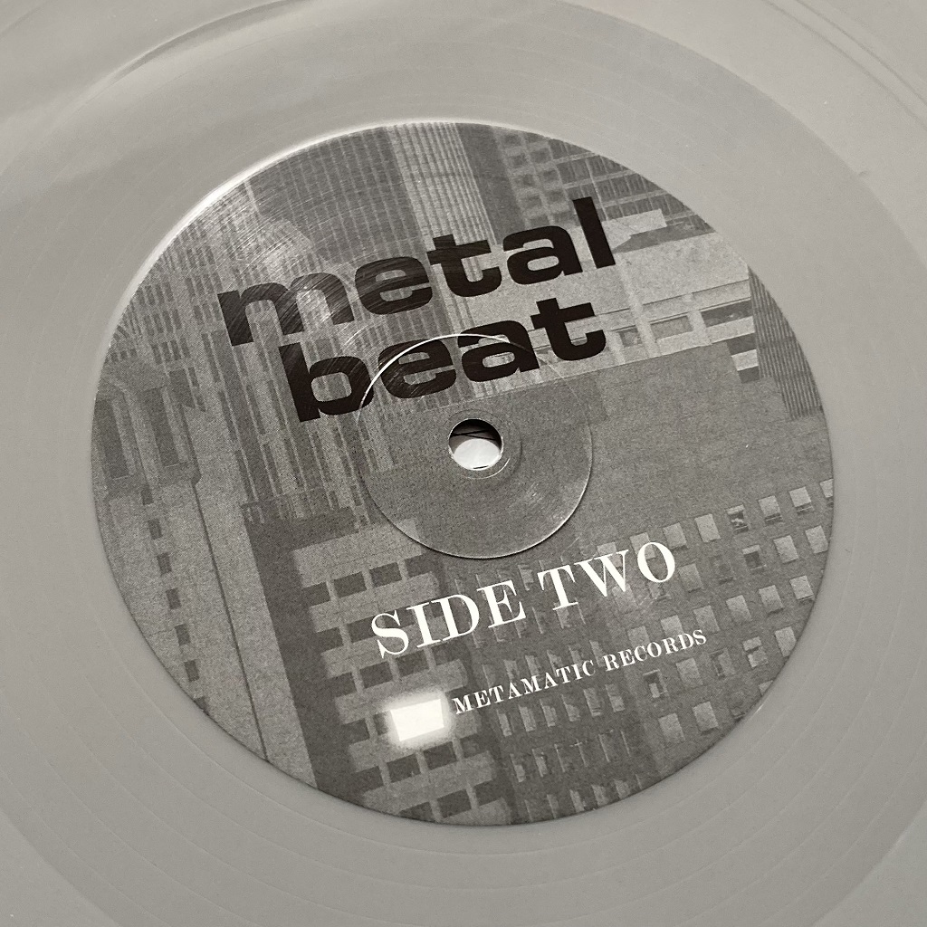 In respect of the design aesthetics, I’ve already noted that it fits in well with the ‘Metamatic’ period styling, but I love some of the small details such as the record labels. These have retained the same design principle as the original ‘Metal Beat’ releases from 1980, but subtly updated them by way of the choice of black and white architectural photos used as background images on each side, while retaining the Eurostile Bold Extended lowercase typeface for the ‘Metal Beat’ logo.