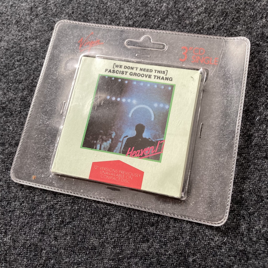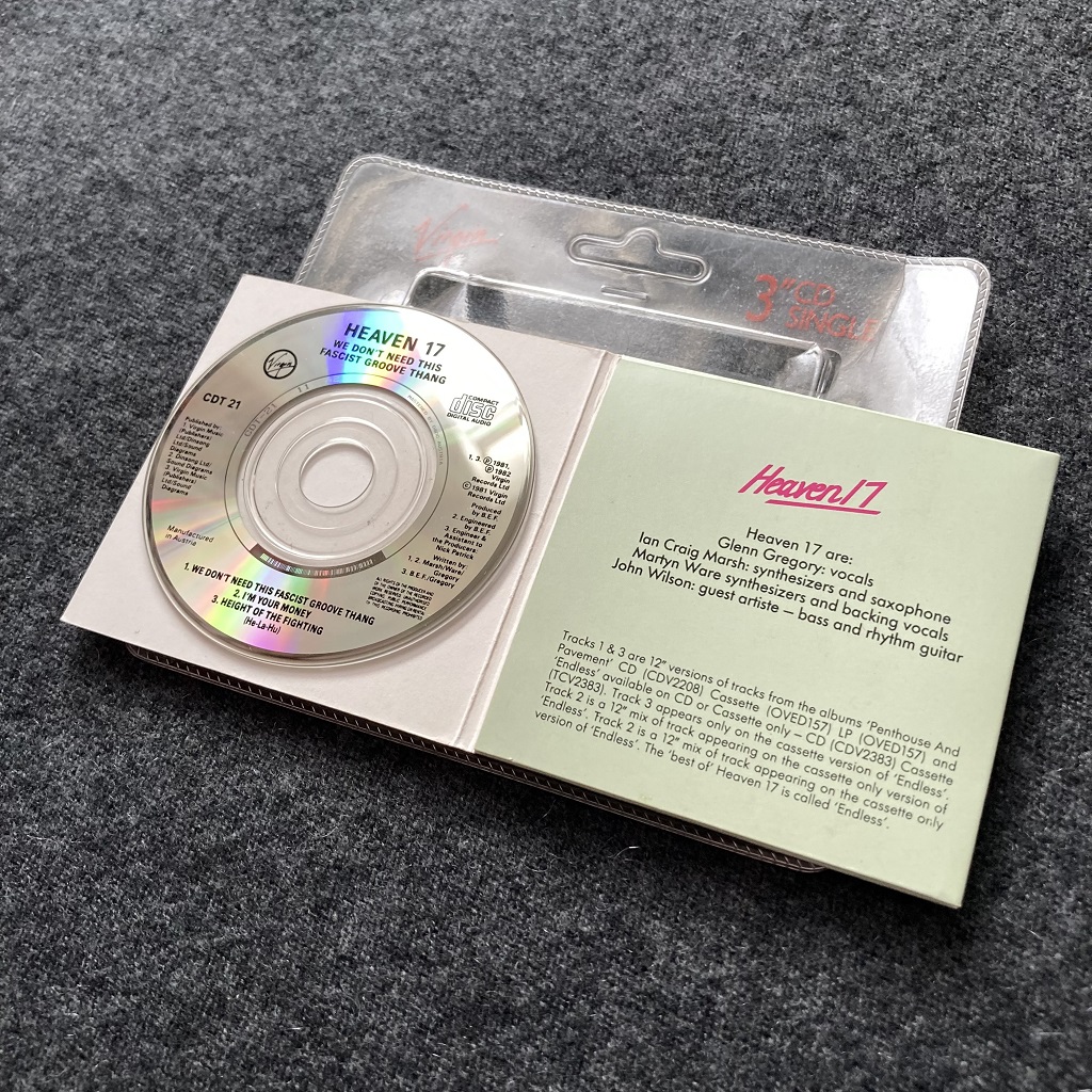 This curious little 3″ CD single of Heaven 17’s 1981 debut single, ‘(We Don’t Need This) Fascist Groove Thang’, featuring three 12″ single mixes from their back catalogue, was released as part the Virgin CDT series, a series of re-issues of classic singles from the Virgin back catalogue on the then in-vogue 3″ CD single format. The series flagged the selling point of containing ‘12” versions previously unavailable on compact disc’ by way of a flash box printed at the foot of the front cover design. The covers were tiny replicas in keeping with the original sleeve designs for the most part, and came packaged in generic Virgin records clear plastic ‘blister pack’ covers, though the choice of tracks often had odd combinations of mixes, that were not necessarily quite the intended ’12” mix’ that the hype would have you believe.